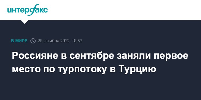 Москва. 28 октября. INTERFAX.RU - Турцию с января по сентябрь посетили 34,8 млн иностранных туристов, Россия за 9 месяцев заняла второе место по турпотоку, а в сентябре - первое, следует из статистики министерства культуры и туризма республики.