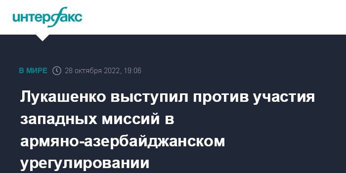 Москва. 28 октября. INTERFAX.RU - Президент Белоруссии Александр Лукашенко выступил против привлечения западных миссий к урегулированию армяно-азербайджанского конфликта. Он считает, что договориться должны Армения и Азербайджан при посредничестве России.