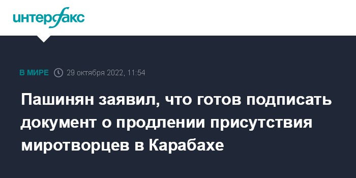 Москва. 29 октября. INTERFAX.RU - Премьер-министр Армении Никол Пашинян заявил о готовности подписать в Сочи документ о продлении присутствия российских миротворцев в Нагорном Карабахе.