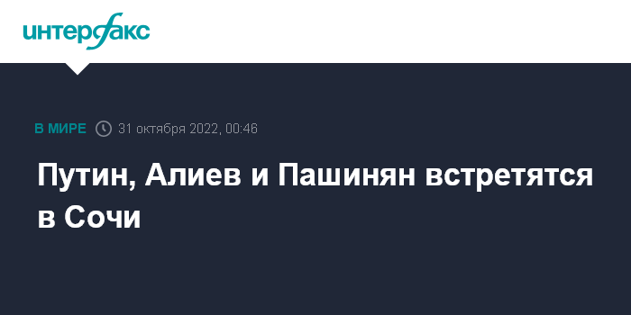 Москва. 31 октября. INTERFAX.RU - Президент РФ Владимир Путин в понедельник в Сочи соберет за столом переговоров президента Азербайджана Ильхама Алиева и премьера Армении Никола Пашиняна.