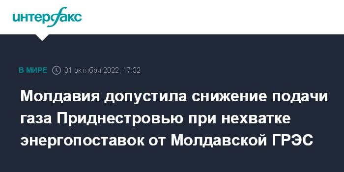 Москва. 31 октября. INTERFAX.RU - Молдавия сократит подачу газа Приднестровью, если Молдавская ГРЭС, расположенная в левобережье Днестра и принадлежащая "Интер РАО", не будет поставлять достаточно электроэнергии для Молдавии. Об этом заявил молдавский вице-премьер Андрей Спыну, комментируя готовящееся подписание контракта госкомпании Energocom с ГРЭС на поставки электроэнергии в ноябре.