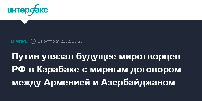 Москва. 31 октября. INTERFAX.RU - Возможность продления мандата на присутствие российских миротворцев в Карабахе зависит от решений по демаркации и делимитации границы между Арменией и Азербайджаном, и от заключения мирного договора, заявил президент РФ Владимир Путин.