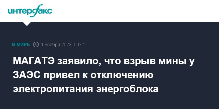 "В результате взрыва наземной мины оборвалась основная линия электропитания одного из энергоблоков Запорожской АЭС (...). Взрыв произошел 30 октября вечером за пределами ограждения по периметру ЗАЭС, отключив внешнюю линию электропередачи напряжением 750 киловольт", - говорится в заявлении Гросси.