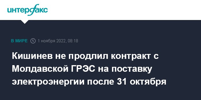 Москва. 1 ноября. INTERFAX.RU - Контракт между молдавской госкомпанией Energocom и расположенной в Приднестровье Молдавской ГРЭС на поставку в Молдавию электроэнергии не продлен, сообщил в Telegram вице-премьер - министр инфраструктуры и регионального развития Молдавии Андрей Спыну.