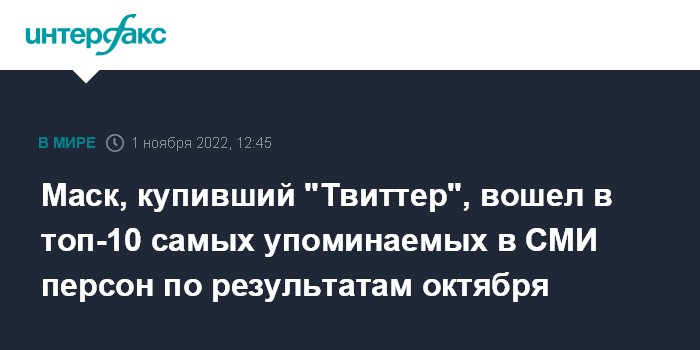 На десятую строчку топ-10 самых упоминаемых в прессе персон поднялся американский миллиардер Илон Маск (20 470 ссылок), который в октябре завершил покупку соцсети Twitter после длительных переговоров и сам возглавил компанию. Также в начале прошлого месяца Маск в Twitter изложил свой взгляд на возможности урегулирования украинского кризиса, вызвав резкую критику в Киеве.
