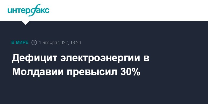 Москва. 1 ноября. INTERFAX.RU - По состоянию на 1 ноября, после прекращения поставок с Молдавской ГРЭС, дефицит электроэнергии в Молдавии составил примерно одну треть объема (около 4070 МВт/час), потребляемого правым берегом Днестра. Об этом заявил вице-премьер, министр инфраструктуры Молдавии Андрей Спыну.