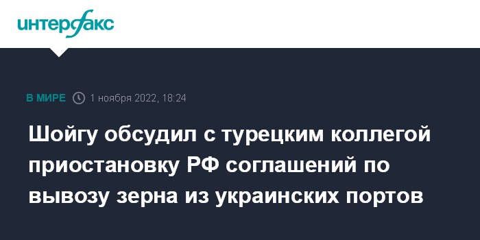 Шойгу обсудил с турецким коллегой приостановку РФ соглашений по вывозу зерна из украинских портов