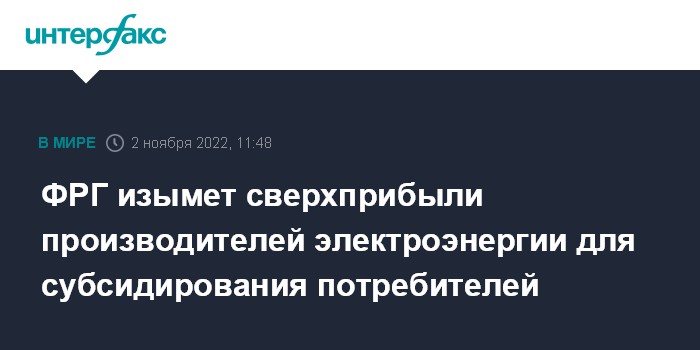 Москва. 2 ноября. INTERFAX.RU - Германия планирует изымать сверхприбыли электроэнергетических компаний, несмотря на наличие сомнений в правомерности таких действий. Об этом сообщает агентство Bloomberg со ссылкой на оказавшийся в его распоряжении правительственный документ.