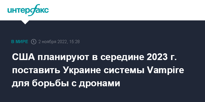 Москва. 2 ноября. INTERFAX.RU - США рассчитывают предоставить Украине в середине будущего года системы Vampire, которые могут быть использованы против беспилотников, сообщает в среду Defense news со ссылкой на представителя Пентагона Пата Райдера.