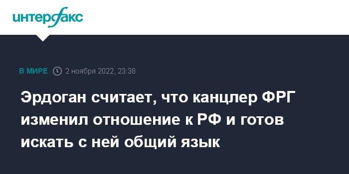 Москва. 2 ноября. INTERFAX.RU - Канцлер ФРГ Олаф Шольц смягчил позицию по России и теперь выступает за поиск с ней общих позиций, заявил в среду президент Турции Реджеп Тайип Эрдоган.