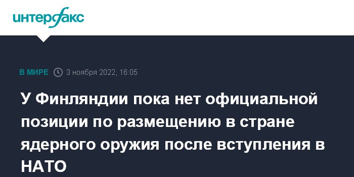 "В предложении не рассматривается вопрос о том, будет ли развернуто ядерное оружие в Финляндии после присоединения. Однако в предложении подчеркивается, что Финляндия поддерживает ядерное разоружение всех стран. В то же время, как государство-член НАТО, Финляндия будет охвачена защитой ядерного оружия альянса", - приводит позицию правительства портал Yle.