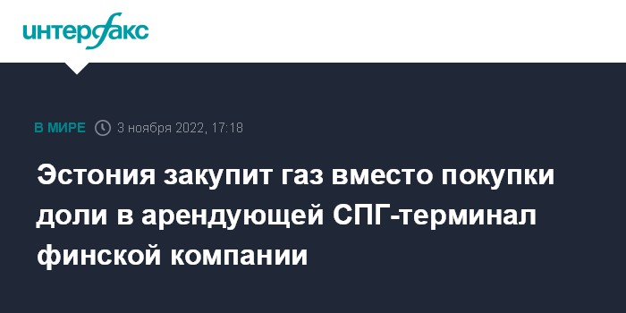 "Вопрос в том, нужно ли нам это (покупка доли - ИФ) для обеспечения надежности снабжения этой зимой. На данный момент, с учетом того, что в Финляндии и Балтийском регионе газа достаточно, а участники рынка хотят, чтобы газовые танкеры поступали к финскому терминалу, похоже, что чрезмерного спроса нет", - сказала Сиккут, отметив, что по мнению эстонских участников рынка условия пользования терминалом являются разумными.