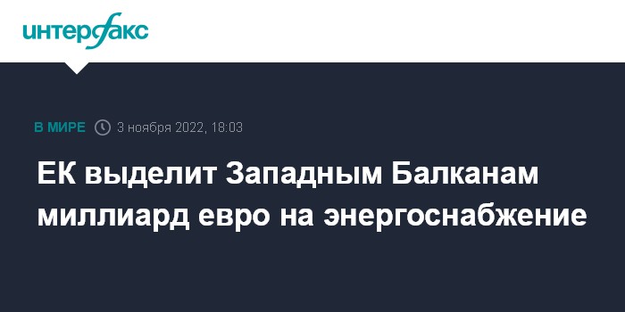 Москва. 3 ноября. INTERFAX.RU - Евросоюз выделит государствам Западных Балкан 1 млрд евро в виде грантов, чтобы помочь им справиться с непосредственными последствиями энергетического кризиса и повысить энергетическую устойчивость в дальнейшем. Об этом заявила председатель Еврокомиссии (ЕК) Урсула фон дер Ляйен.