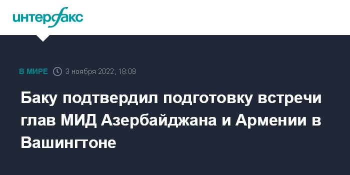 Москва. 3 ноября. INTERFAX.RU - МИД Азербайджана подтвердило предстоящую встречу в Вашингтоне глав внешнеполитических ведомств Азербайджана Джейхуна Байрамова, Армении Арарата Мирзояна и государственного секретаря США Энтони Блинкена.