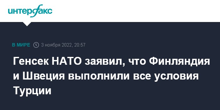 Москва. 3 ноября. INTERFAX.RU - Финляндия и Швеция добросовестно выполнили условия Анкары для вступления в НАТО, и теперь пришло время принять их в альянс, заявил генсек НАТО Йенс Столтенберг. Он сказал об этом на совместной пресс-конференции с главой МИД Турции Мевлютом Чавушоглу.
