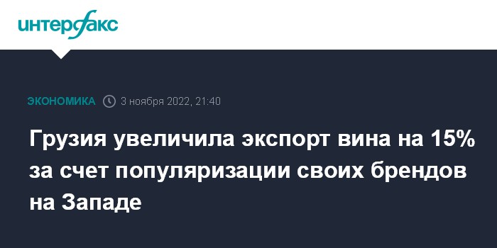 Москва. 3 ноября. INTERFAX.RU - В январе-сентябре 2022 года экспорт вина из Грузии вырос на 15% в сравнении с аналогичным периодом рекордного 2021 года, сообщил в парламенте страны глава Национального агентства вина Леван Мехузла. Его заявление привела пресс-служба парламента.