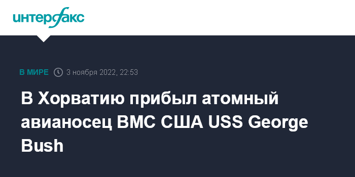 Москва. 3 ноября. INTERFAX.RU - Американский атомный авианосец USS George Bush ("Джордж Буш"), находящийся на патрулировании с боевыми кораблями сопровождения в Восточном Средиземноморье, в акватории Адриатики, зашел в Хорватский порт Сплит, сообщил в четверг 6-й оперативный флот США.