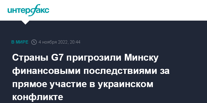 Москва. 4 ноября. INTERFAX.RU - Страны "Большой семерки" пригрозили Белоруссии "огромными дополнительными расходами" в случае ее прямого участия в украинском конфликте.
