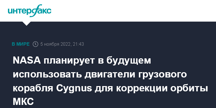 Москва. 5 ноября. INTERFAX.RU - Национальное управление США по аэронавтике и исследованию космического пространства (NASA) планирует в будущем использовать двигатели грузового космического корабля Cygnus компании Northrop Grumman для коррекции орбиты Международной космической станции (МКС), сообщил в субботу руководитель программы агентства на МКС Джоэль Монтальбано.