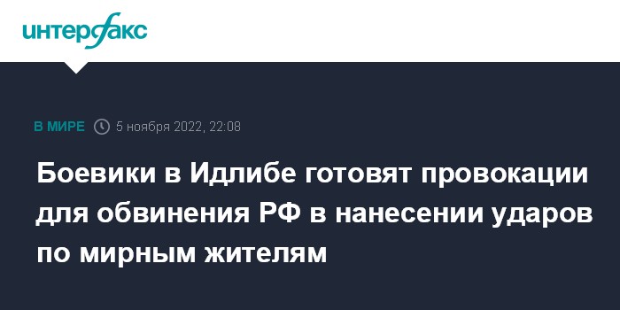 Москва. 5 ноября. INTERFAX.RU - Российские военные располагают информацией о том, что боевики террористической группировки "Джабхат ан-Нусра" ("Джабхат ан-Нусра" ("Джебхат Фатх аш-Шам") - террористическая группировка, деятельность которой запрещена в России) совместно с организацией "Белые каски" планируют проведение провокаций в сирийской провинции Идлиб для обвинение сирийских правительственных сил и ВКС России в нанесении ударов по мирным жителям и гуманитарным объектам.