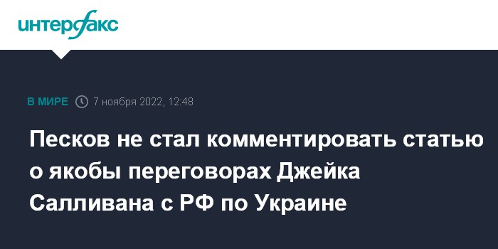 Москва. 7 ноября. INTERFAX.RU - В Кремле не комментируют публикацию The Wall Street Journal о том, что советник президента США по нацбезопасности Джейк Салливан ведет конфиденциальные переговоры с российской стороной по Украине, но отмечают, что британские и американские СМИ сообщают много недостоверной информации.
