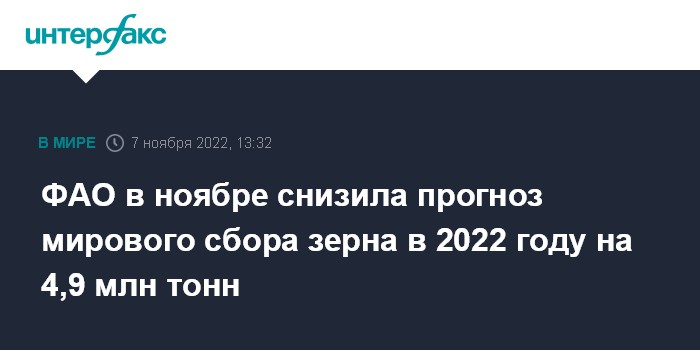 ФАО в ноябре снизила прогноз мирового сбора зерна в 2022 году на 4,9 млн тонн