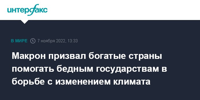 Москва. 7 ноября. INTERFAX.RU - Президент Франции Эммануэль Макрон в понедельник заявил, что намерен оказывать давление на богатые неевропейские страны, в частности США, с тем, чтобы они помогали бедным государствам в борьбе с изменением климата.