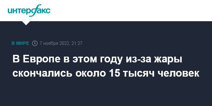 Москва. 7 ноября. INTERFAX.RU - В странах Европы в 2022 году вследствие высоких температур воздуха умерли как минимум 15 тыс. человек, сообщило европейское бюро ВОЗ.
