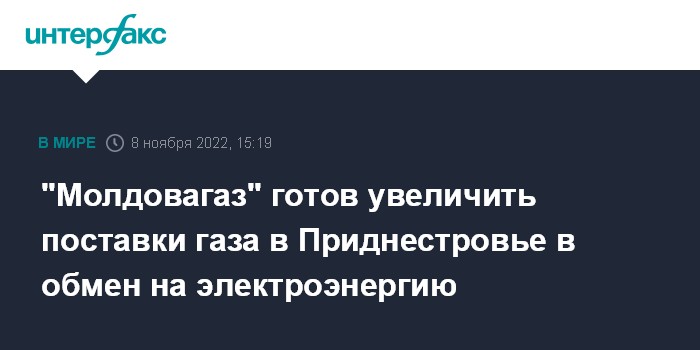 Москва. 8 ноября. INTERFAX.RU - АО "Молдовагаз" готово увеличить поставки газа в Приднестровье при условии получения взамен электроэнергии, заявил вице-премьер - министр инфраструктуры и регионального развития Молдавии Андрей Спыну журналистам во вторник, отвечая на вопрос о путях преодоления энергетического кризиса.