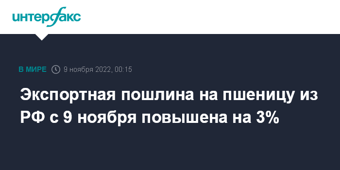 Экспортная пошлина на пшеницу из РФ с 9 ноября повышена на 3%