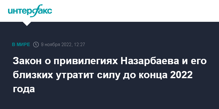 Москва. 9 ноября. INTERFAX.RU - В Казахстане закон "О первом президенте - Елбасы" о заслугах Нурсултана Назарбаева и о привилегиях для него и его семье утратит силу до конца 2022 года, сообщил "Интерфаксу" депутат Мажилиса Ерлан Саиров.