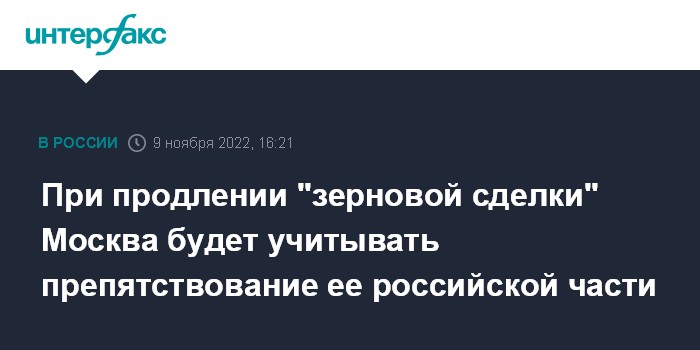 При продлении "зерновой сделки" Москва будет учитывать препятствование ее российской части