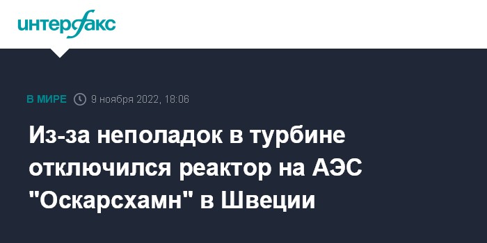 Москва. 9 ноября. INTERFAX.RU - Третий энергоблок шведской АЭС "Оскарсхамн" выключен в среду из-за неполадок в турбине, сообщает шведское телевидение.