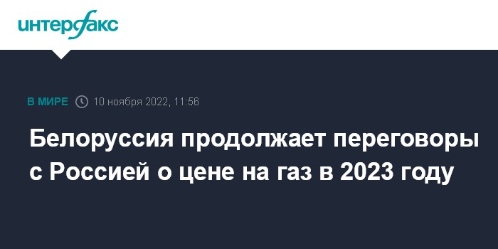Москва. 10 ноября. INTERFAX.RU - Белоруссия продолжает с Россией переговоры о цене на газ в 2023 году и рассчитывает на равные с российскими условия для субъектов хозяйствования, заявил через пресс-службу министр энергетики республики Виктор Каранкевич.