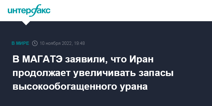 Москва. 10 ноября. INTERFAX.RU - В МАГАТЭ в четверг заявили, что Иран увеличил запасы высокообогащенного урана, а также выступили с критикой в адрес Тегерана за недопуск инспекторов агентства на иранские ядерные объекты, передает Associated Press (AP).