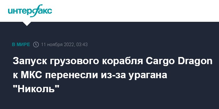 Москва. 11 ноября. INTERFAX.RU - Запуск грузового космического корабля Cargo Dragon компании SpaceX к Международной космической станции состоится не ранее 21 ноября из-за урагана "Николь", обрушившегося на Флориду, сообщило в пятницу Национальное управление США по аэронавтике и исследованию космического пространства (NASA).
