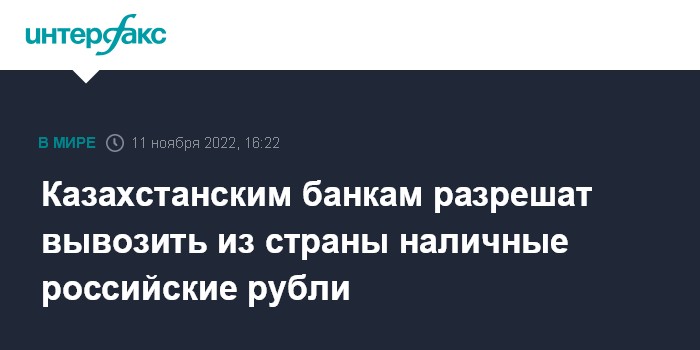 Москва. 11 ноября. INTERFAX.RU - Правительство Казахстана планирует разрешить банкам второго уровня вывоз из республики наличных российских рублей, следует из проекта соответствующего постановления, опубликованном на сайте "Открытые НПА".
