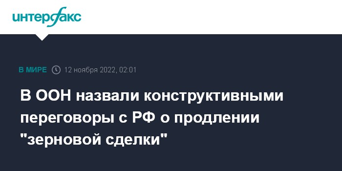 Москва. 12 ноября. INTERFAX.RU - В ООН назвали прошедшие с Москвой переговоры о продлении "зерновой сделки" конструктивными.