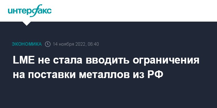 Москва. 14 ноября. INTERFAX.RU - Лондонская биржа металлов (LME) приняла решение не вводить ограничения на новые поставки металлов из России, следует из сообщения биржи.