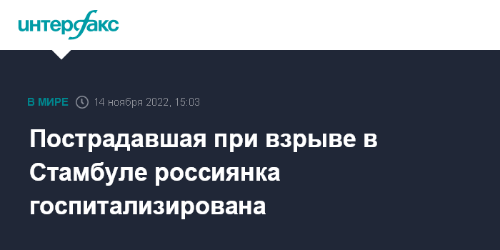 Москва. 14 ноября. INTERFAX.RU - Из трех граждан РФ, пострадавших при взрыве на улице Истикляль в Стамбуле, одна россиянка госпитализирована, сообщает Генконсульство России в Стамбуле.