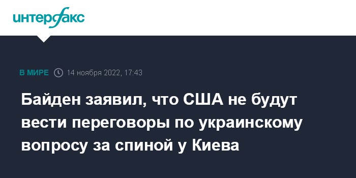 "Мы не будем участвовать в каких-либо переговорах: ничего не может быть сделано по Украине без Украины. Это (переговоры по урегулированию - ИФ) - решение, которое должна принимать сама Украина", - сказал Байден на пресс-конференции на Бали.
