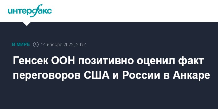 Москва. 14 ноября. INTERFAX.RU - Генсек ООН Антониу Гутерриш приветствовал встречу представителей России и США в Анкаре и отметил, что возглавляемая им организация отношения к этим контактам не имеет.