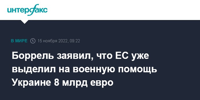 Москва. 15 ноября. INTERFAX.RU - Высокий представитель ЕС по иностранным делам Жозеп Боррель заявил, что в целом военная помощь ЕС и государств Евросоюза Украине достигает 8 млрд евро, и призвал не путать ее с помощью только в рамках Европейского фонда мира, которая составляет 3,1 млрд евро.