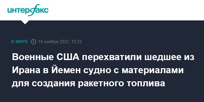 Москва. 15 ноября. INTERFAX.RU - Корабли США остановили в Оманском заливе направлявшееся из Ирана в Йемен судно и в ходе обыска на его борту обнаружили 70 тонн спрятанного перхлората аммония - компонента топлива для боевых ракет, сообщает Associated Press (AP).