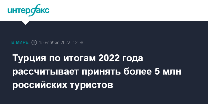 Москва. 15 ноября. INTERFAX.RU - Турция по итогам 2022 года рассчитывает принять значительно больше российских туристов, чем прогнозировалось - к середине ноября турпоток из России достиг 4,5 млн, сообщил во вторник атташе по культуре и туризму посольства страны в РФ Илькер Озкан.