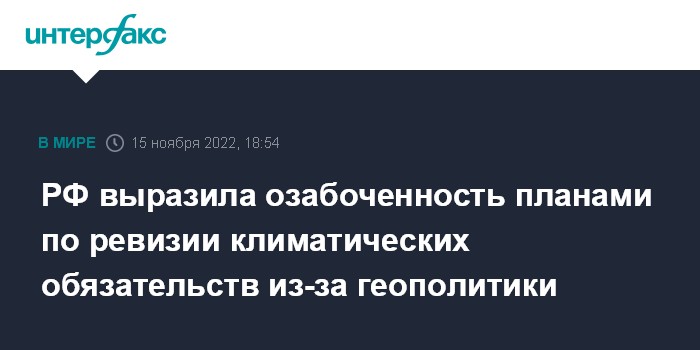 "Выражаем серьезную озабоченность планами отдельных государств и региональных объединений по ревизии ранее взятых обязательств под предлогом непростой геополитической ситуации. Россия предупреждала о негативных последствиях "гонки климатических амбиций", когда провозглашение углеродной нейтральности происходило без должной стратегии и ресурсно-финансового обеспечения", - сказал он, добавив, что стороны Рамочной конвенции об изменении климата (РКИК) ООН и Парижского соглашения имеют право самостоятельно выбирать средства достижения климатических целей.