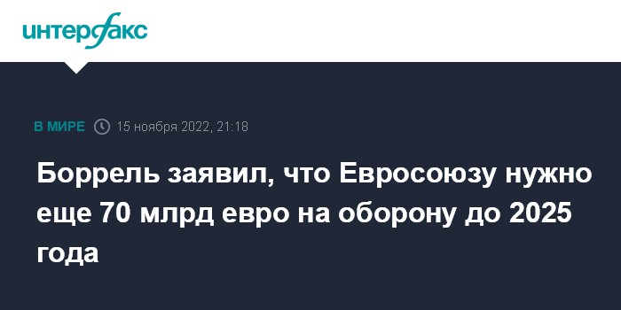 Москва. 15 ноября. INTERFAX.RU - Высокий представитель ЕС по иностранным делам и политике безопасности и обороны Жозеп Боррель заявил, что Евросоюзу для восполнения отставания в его оборонном потенциале до 2025 года понадобятся дополнительные 70 млрд евро.