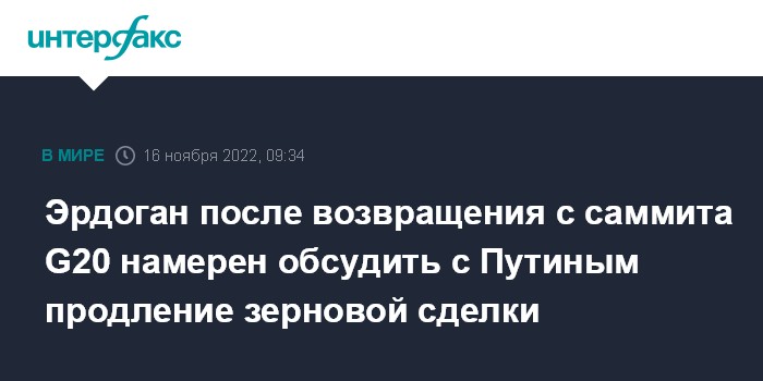 "После возвращения в Турцию (с саммита G20 - ИФ) мы сразу же продолжим развивать нашу телефонную дипломатию с Путиным. Я думаю, договоренность сохранится. Переговоры по зерновому коридору продолжаются. На данный момент никаких проблем по этому вопросу нет ", - сказал президент Турции.