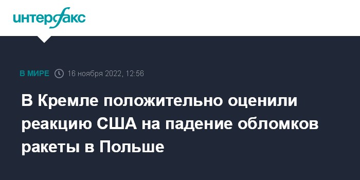 Москва. 16 ноября. INTERFAX.RU - В Кремле отмечают более сдержанную и профессиональную реакцию США по сравнению с истеричными заявлениями из ряда других стран на инцидент с падением обломков ракет в Польше.