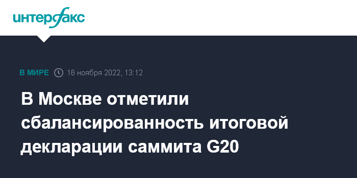 Москва. 16 ноября. INTERFAX.RU - В Кремле отмечают сбалансированность итоговой декларации саммита G20, хотя по теме, связанной со спецоперацией России на Украине, присутствуют разные точки зрения.